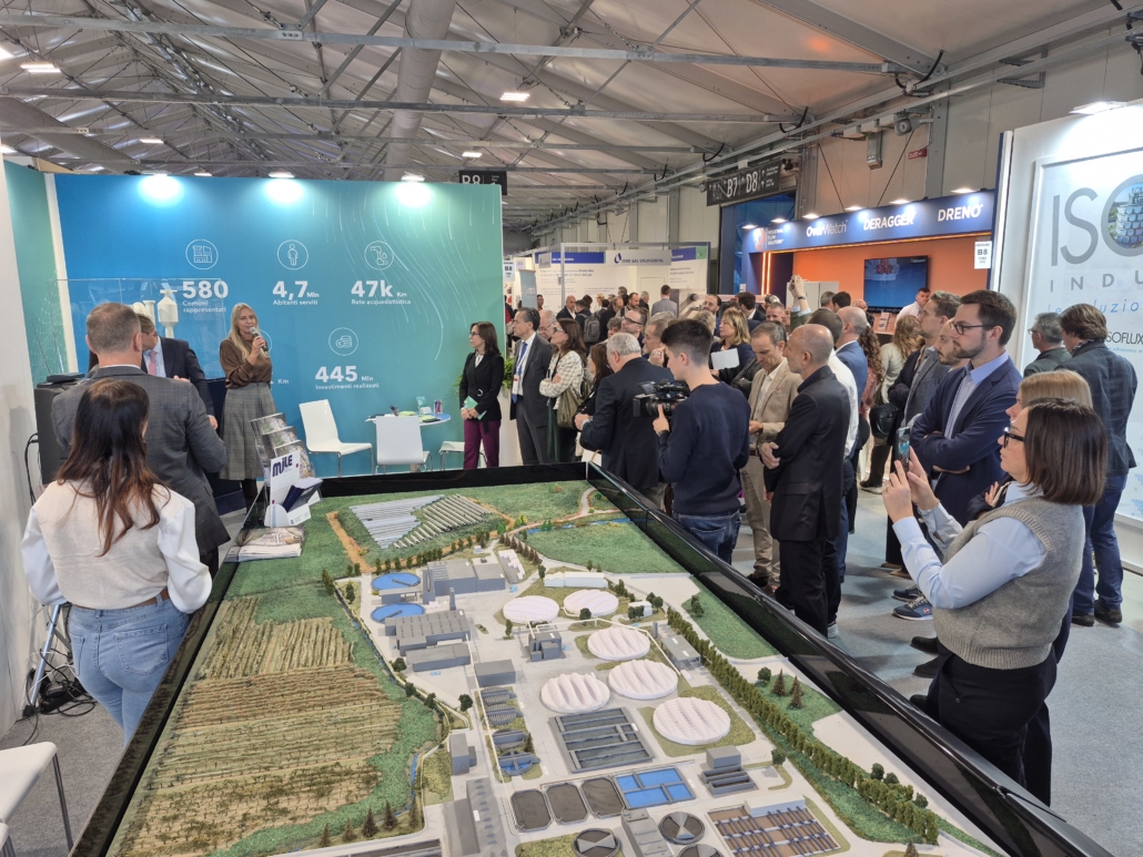 Nello stand di Viveracqua, consorzio che riunisce i 12 gestori idrici pubblici del Veneto, con la collaborazione di Utilitalia, la federazione che riunisce le aziende italiane operanti nei servizi pubblici, è stato mostrato il plastico dell’impianto pilota che riproduce la nuova tecnologia in fase di brevettazione che ha ricevuto nei giorni scorsi l’Attestato di Buona Pratica Territoriale per un’Italia più Sostenibile da parte di ASviS, (Alleanza Italiana per lo Sviluppo Sostenibile), la rete di oltre 300 soggetti impegnati per l’attuazione dell’Agenda 2030 delle Nazioni Unite e dei suoi 17 Obiettivi di sviluppo sostenibile.